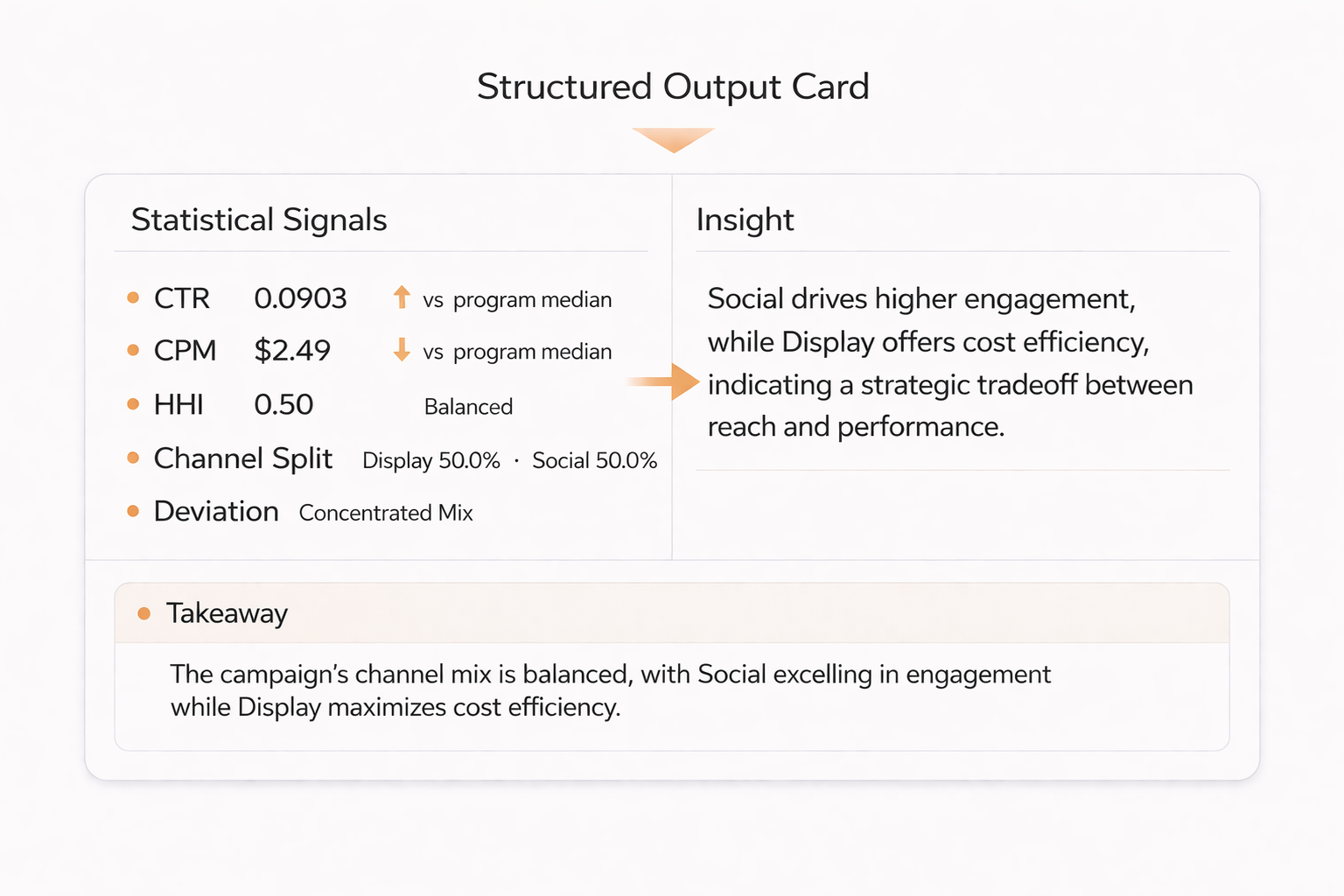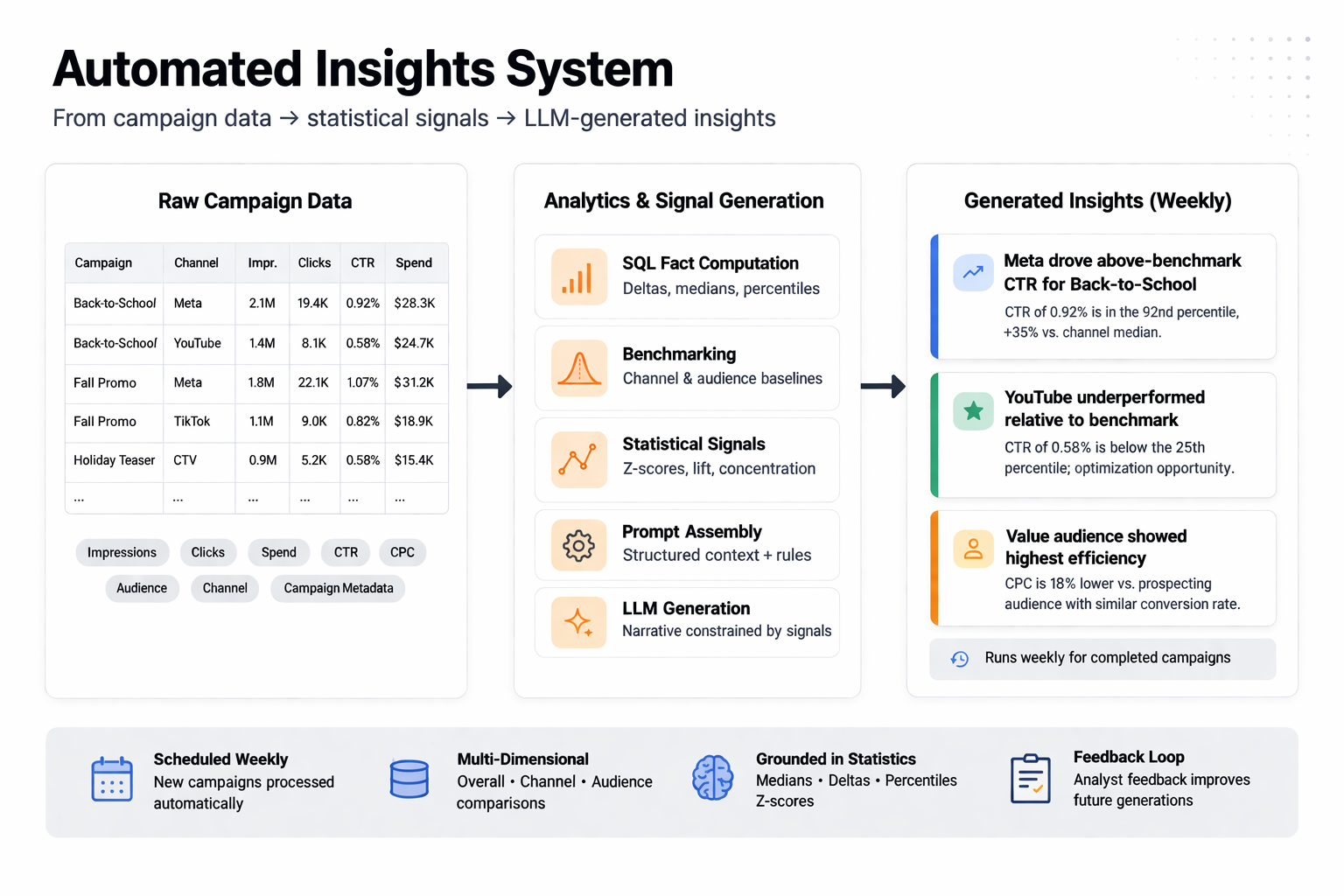 Instead of relying on external comparisons, the system evaluates campaigns relative to historical baselines, surfacing meaningful deviations, trends, and opportunities.