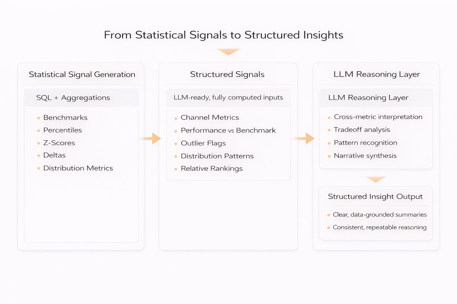 I designed a system that formalizes insight generation by combining statistical benchmarking with structured LLM interpretation.